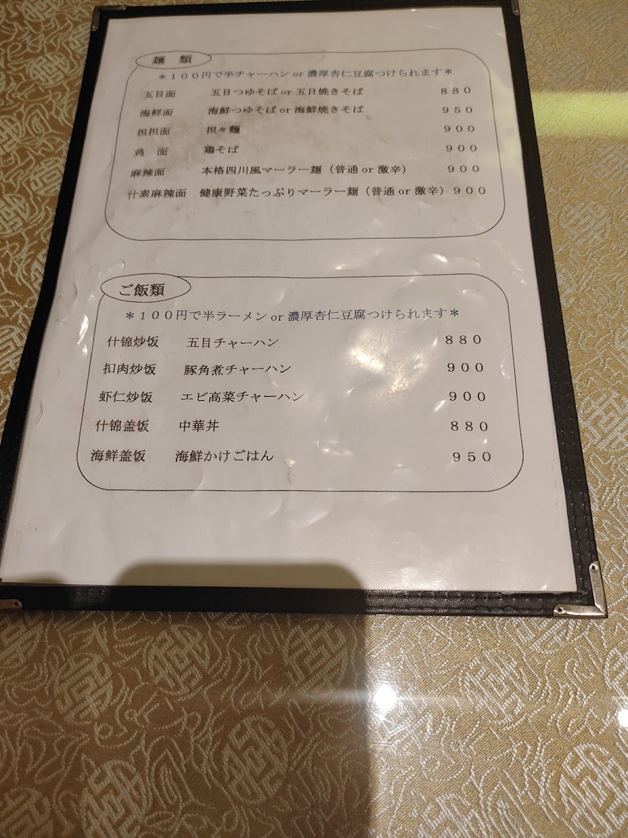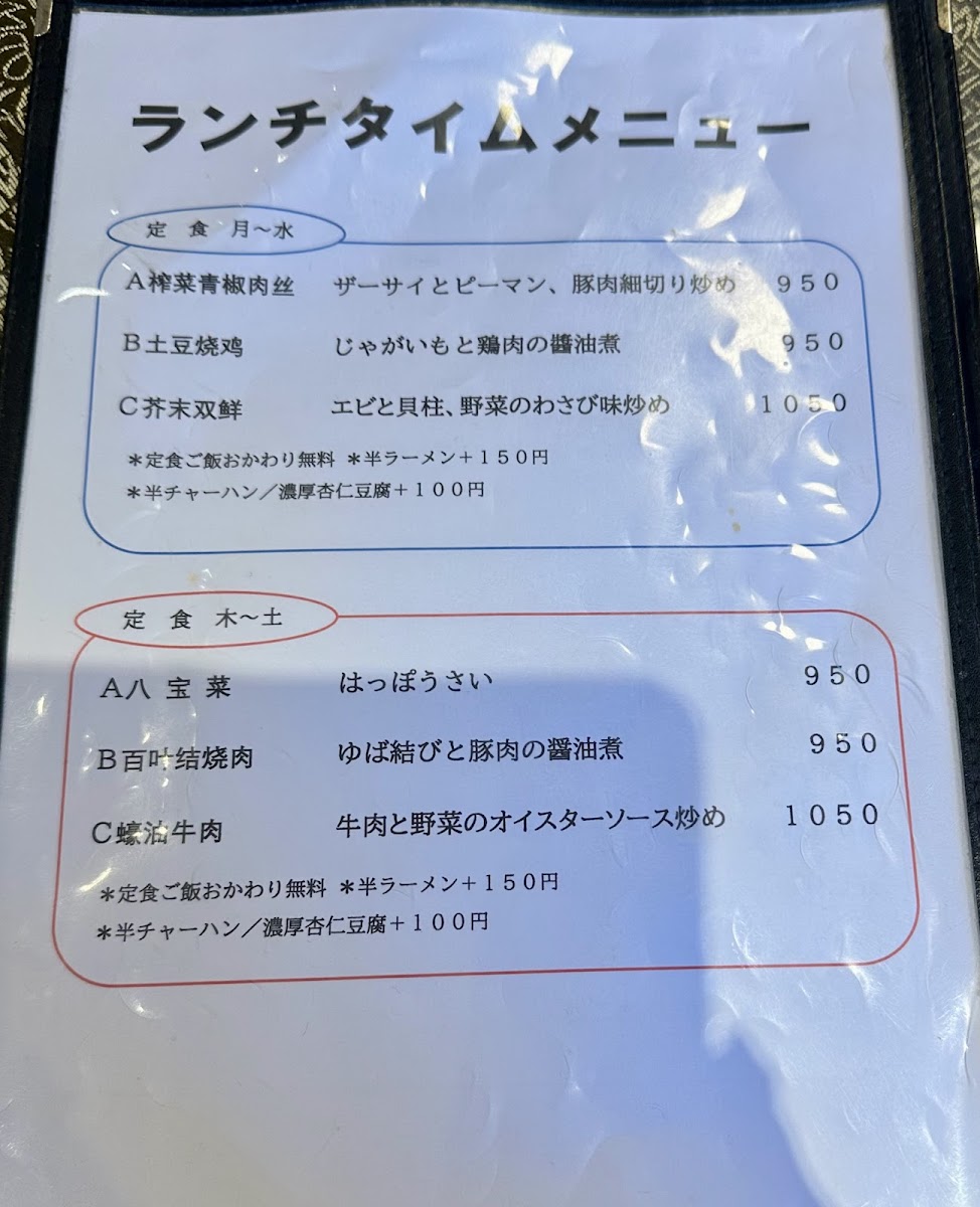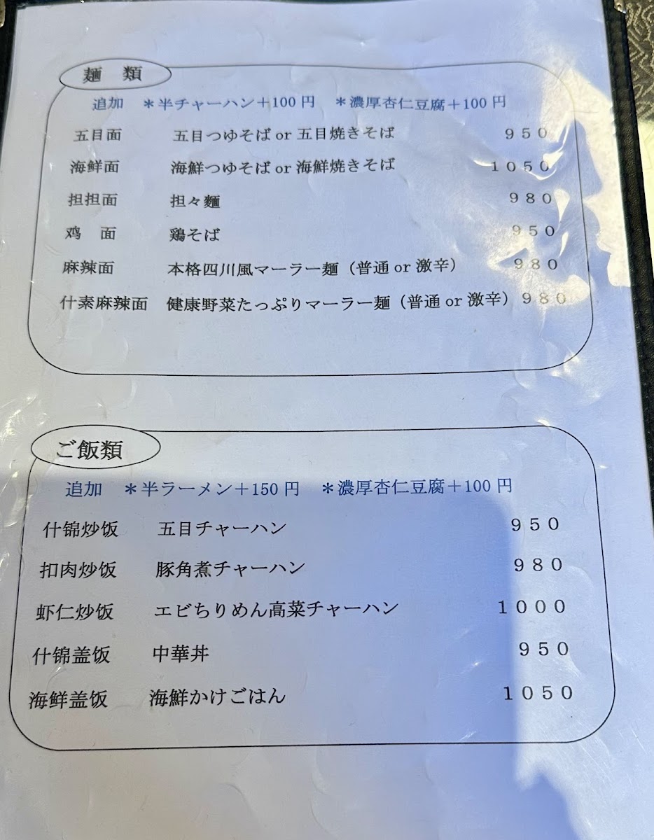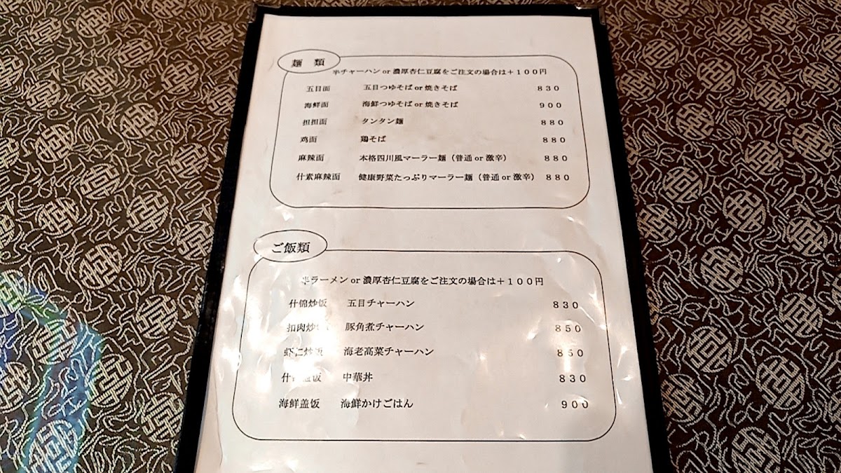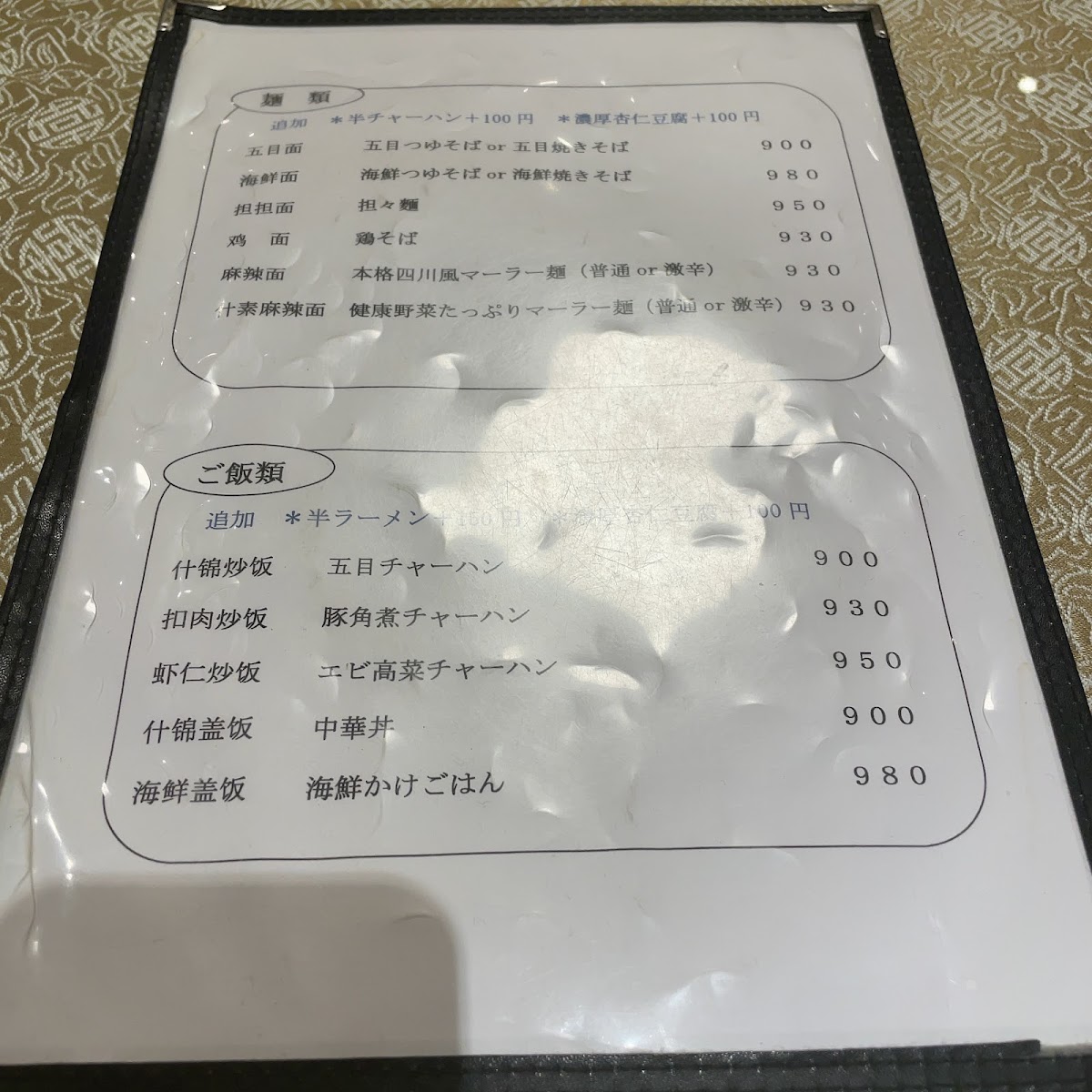 For a lighter option, the ライス (Rice) is a simple and versatile accompaniment to many dishes. The 野菜たっぷりマーラー麺 (Vegetable-packed Mala Noodles) offers a spicy and aromatic flavor, while the 冷やし担々麺 (Cold Dan Dan Noodles) provides a refreshing, chilled version of the classic dish. The 麻婆春雨定食 (Mapo Glass Noodle Set) and the 四川風マーラー麺 (Sichuan-style Mala Noodles) bring a punch of heat and flavor, while the 回鍋肉丼 (Twice-Cooked Pork Bowl) is a comforting and hearty meal. Lastly, the 麻婆豆腐ランチ (Mapo Tofu Lunch) is perfect for those who love bold, spicy flavors, and the 葱油鸡 (Scallion Oil Chicken) offers a delicate yet flavorful dish.